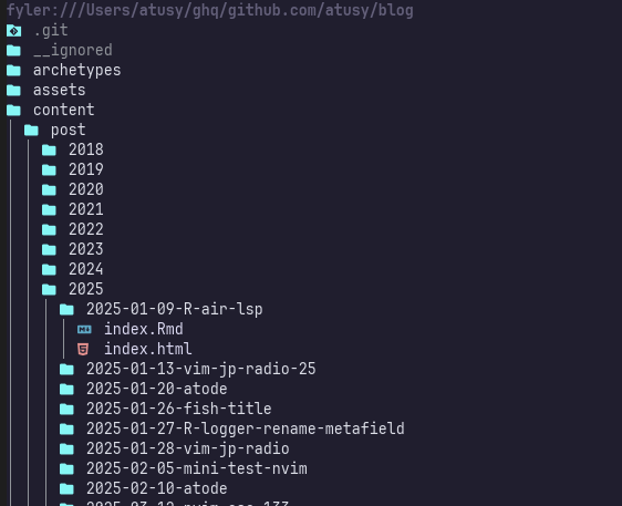 これまでサイドバー型ツリー表示のnvim-neo-tree/neo-tree.nvimを使っていたものの、サイドバーじゃなくていいよ派の意見を確かめてみたかったこともあり、非サイドバー型ツリー表示のA7Lavinraj/fyler.nvimを試してみます。